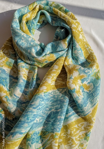 foulard, blue, yellow, gold, teal, fabric, textile, pattern, clothing, accessory, fashion, winter, spring, summer, autumn, style, soft, warm, comfortable, elegant, stylish, printed, abstract, design, texture, background, light, shadow, enclosed, neck, fall, beautiful, shawl, muffler, long, rectangle, square, cotton, silk, wool, cashmere