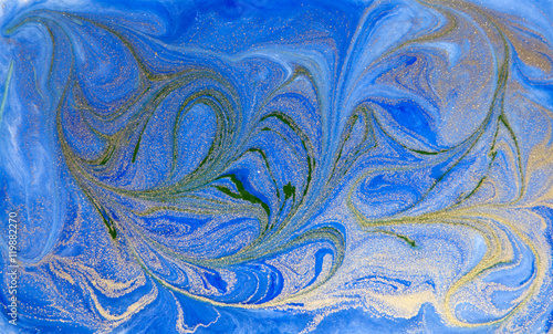 Blue and golden liquid texture, watercolor hand drawn marbling illustration, abstract background, aqua print