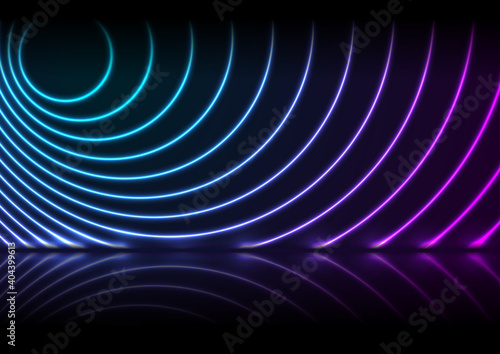 Blue and purple neon laser circles with reflection. Abstract technology retro background. Futuristic glowing vector design.