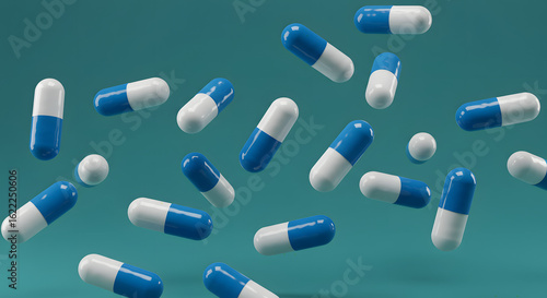 capsule, pill, blue, white, medication, medicine, pharmaceutical, drug, tablet, floating, scattered, teal, background, medicals, health care, treatment, health, pharmacy, clinical, laboratory, scientific, medical equipment, medical science, therapeutic