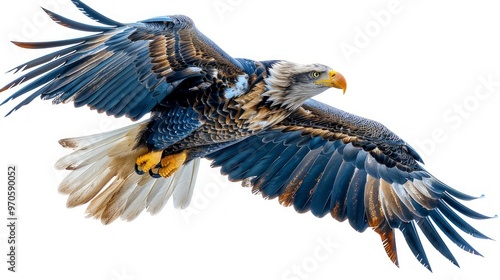 Blue and White eagle flying with spread wings, isolated on a white background.