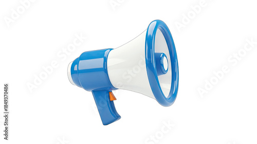 megaphone, blue, white, isolated, background, plastic, handle, speaker, announcement, communication, loud, voice, sound, marketing, advertising, promotion, business, concept, information, message, alert, icon, symbol, object, studio shot, cut-out, digital, graphic, design, copy space, empty space