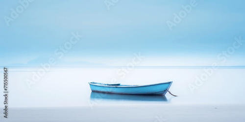 Blue boat in a calm sea waters near a beachline. Calm, tranquil landscape. Generative AI