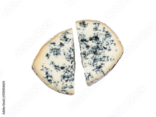 Blue Cheese Delights: Two captivating wedges of blue cheese offer a tantalizing visual feast, showcasing their marbled texture and creamy interiors. Capturing the essence of culinary delight.