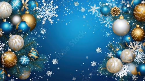 Blue Christmas background with snowflakes and festive ornaments