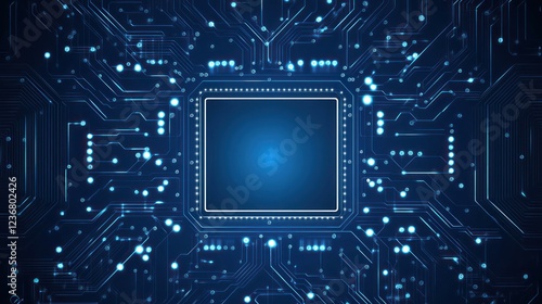 Blue circuit board with central chip, bright dots on lines, used for tech backgrounds