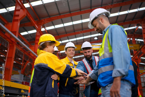 holding hands, celebration, congratulating, oneness, working class, co-worker, factory, assembly line, industry, industrial building, teamwork, professional occupation, expertise, man, woman, male, female, occupation, working, engagement, meeting, safety, happiness, smiling, success, diversity, employee, engineer, engineering, metal industry, labor union, vitality, construction industry, manufacturing, workshop, mechanic