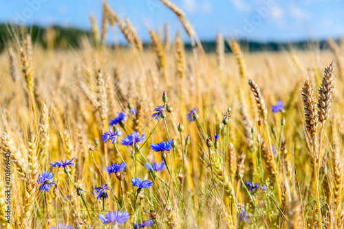 Blue cornflowers grow on the field among the ripe ears of ripe rye