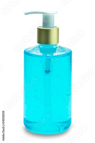 Blue gel alcohol in the pump bottle on a white background isolated with clipping path.