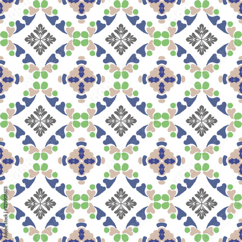 Blue, green, and white embroidery, motif ethnic ikat seamless textile illustration, print striped ornament, pattern, design for wrapping, silk, scarf, clothing, background, textile, carpets, curtains.