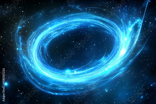Blue Light Ring Illustration with Glowing Curved Lines on Dark Background, Starry Night Sky Effect with White Dots