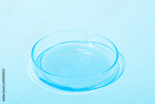 Blue liquid with luster. In a Petri dish. Laboratory research of cosmetics, gel, medicine. Chemistry
