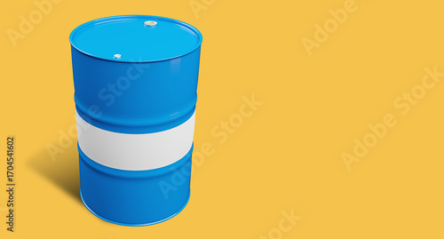 Blue metal barrel with white stripe used for storing industrial liquids, chemicals, or oil. Packaging and logistics container for transport and warehouse operations.