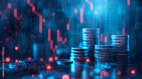 Blue money business graph finance chart diagram on economy 3d coin background with growth financial data concept or investment market profit bar and success market stock technology currency report.