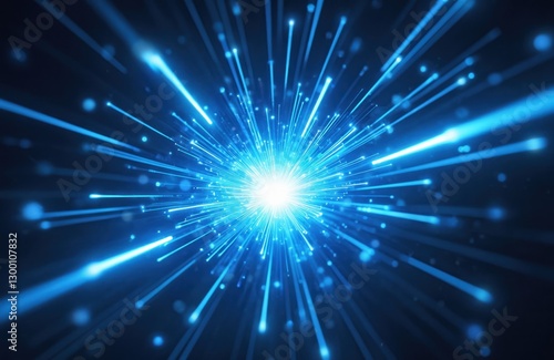 Blue neon light rays explode on dark night background. Generative AI image, visualizes modern cyber tech explosion, digital boom or magic burst with dynamic motion effect.