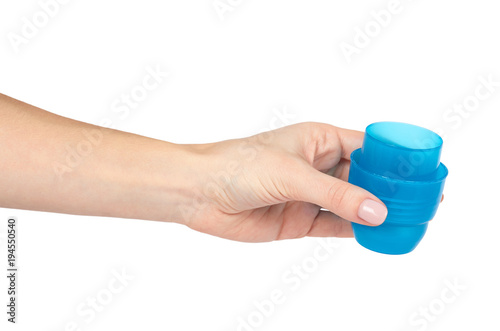 Blue plastic stopper and measure container with hand. Isolated on white background