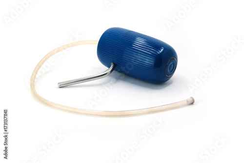 Blue Plastic Water Pump for 20-Litre Bottle with Rubber Hose and Metal Spout on White Background