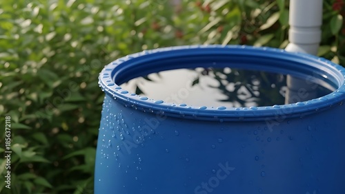barrel, blue, water, rain, garden, pipe, drainage, droplet, green, plant, backyard, collection, watering, storage, environment, weather, hose, container, system, utility, nature, landscape