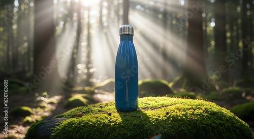 Blue Reusable Water Bottle on Mossy Rock in a Sun-Drenched Forest