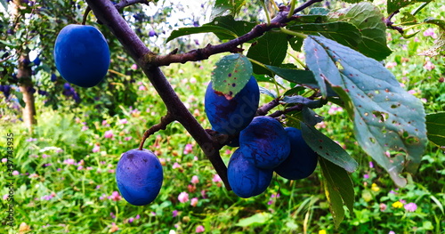 Blue ripe plums on a branch with a leaves.