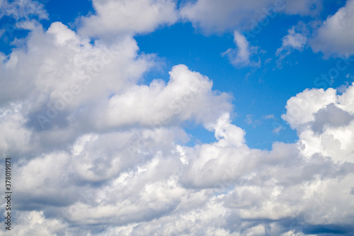 Blue sky with white clouds. Many white clouds on a sunny day. Natural background.