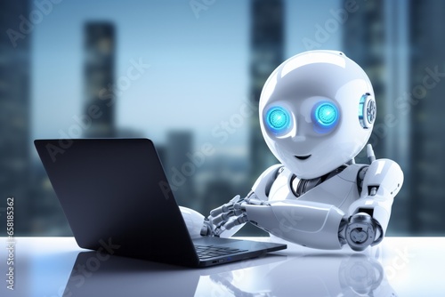 Blue Smiling Computer Robot Working in a Modern Workspace with Laptop