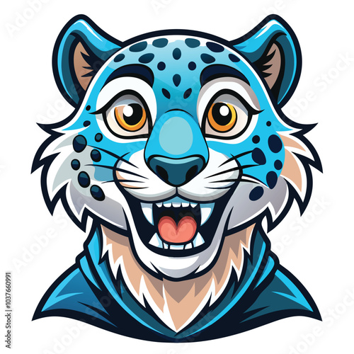 snow leopard, leopard, big cat, cartoon, mascot, design, illustration, blue, white, black, spot, fur, smile, hooded, jacket, animal, wildlife, character, cute, happy, friendly, adorable, fun, playful, graphic, art, digital, vector, artwork, drawing, painting, image, icon, logotype, brand, symbol, digital artwork, graphic design