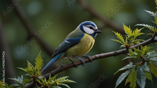 bird, tit, blue, nature, wildlife, animal, avian, spring, green, leaf, tree branch, twig, feather, beak, eye, small, cute, pretty, colourful, vibrant, forest, garden, outdoors, perch, sitting, fauna, wild, closeup, macro, detail, background, bokeh, sunlight, shadow, delicate, plumage, beauty, timberland, flora, ecology, environment, zoology, ornithology, photo, image