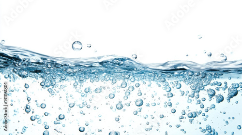 Blue water splash on white background with bubbles and waves