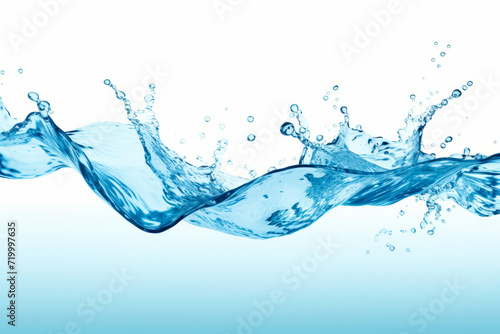 Blue water wave with bubbles and water droplets on white background.