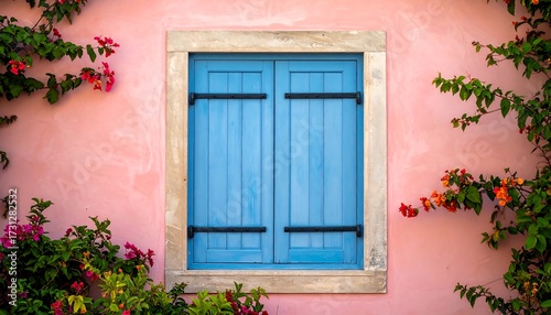 window, shutter, wall, frame, flower, plant, vine, leaf, bougainvillea, facades, exterior, building, house, home, architecture, blue, pink, green, red, vibrant, colourful, pastel, bright, wood, wooden, stucco, stone, in plaster, mediterranean, traditional, rustic, vintage, old, charming, beautiful, summer, sunny, travel, vacation, background, texture, detail, closed, decorative, european
