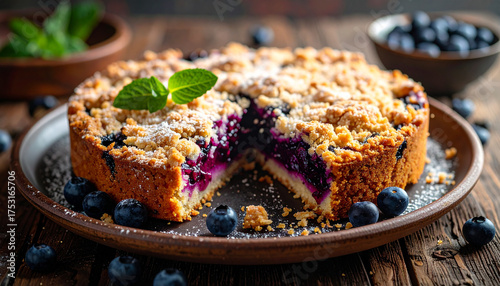 Blueberry crumble cake with sugar dust macro texture on rustic plate in daylight