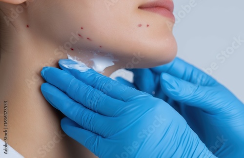 Blue-gloved hands apply cream to a person's acne-affected chin and neck.