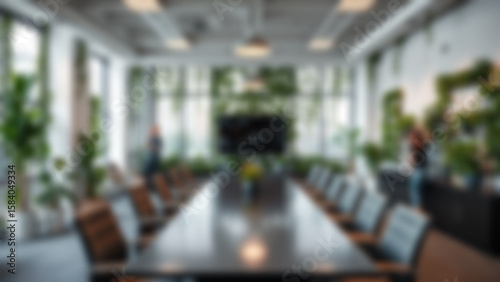 Blur background of office interior with large windows with city urban view, plants, and wooden desks at sunset. Modern workplace and urban greenery concept. Design for poster, wallpaper. Spate.