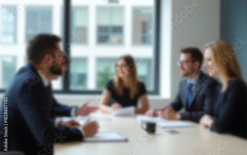 Blur office meeting blurred background with business people working group in boardroom discussion for teamwork brainstorming, executive seminar or professional training in small startup enterprise
