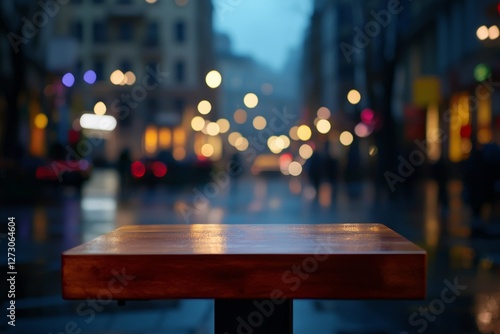 Blurred background of a night street with bokeh lights and an empty wooden table for product display in an urban city at evening