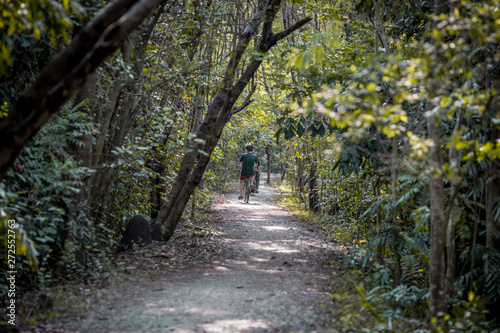 Blurred background of people who are cycling fast, exercising in the park in the morning - evening, the atmosphere is surrounded by nature.