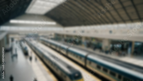 Blurred background of Spacious station ticket area illuminated by skylight from above, airy architecture and soft shadows, modern railway interior background, daytime, natural daylight.