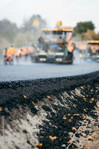 Blurred background of vibratory asphalt rollers compactor compacting new asphalt pavement. Road service building new highway