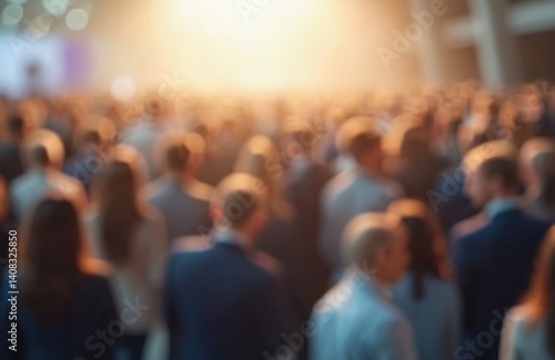 Blurred crowd at corporate event, conference business meeting. Professionals in suits, informal discussion, networking. Audience at seminar, presentation workshop. Business people discuss ideas,
