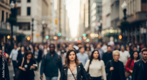 crowd, people, walking, city, street, urban, daytime, diverse, person, businessman, businesswoman, young, blurred, building, skyscraper, warm, bright, caucasian, african american, asian, traffic, commute, commuting, crossing, sidewalk, movement, motion, rush hour, metropolis, gathering, human, public, outdoors, day, exterior, downtown, bokeh, travel, lifestyle, business, modern, energetic, anonymous, neutral, corporate, population, transportation, golden hour