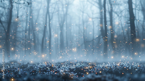 Blurred enchanted forest with fireflies. Mystical forest scene with fireflies illuminating the fog and trees. Perfect for fantasy, magical, and nature themes.