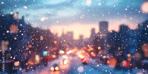 Blurred glowing lights on snowy city streets, creating a cozy wintery urban backdrop with warm and tranquil ambiance, style book illustration