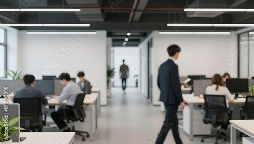 office, modern, blurred, workspace, employee, work, desk, person, man, woman, indoor, corporate, business, interior, computer, chair, table, white, lighting, tile, grey, hallway, window, plant, professional, contemporary, sharpened, suit, back, asian, executive, hall, cabinet, walk, light, ceiling, cubicle, businessman, soft, clean, blurry, pot