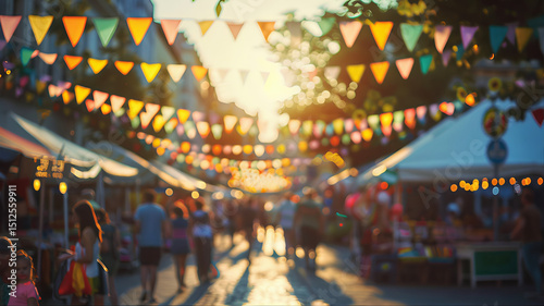 Blurred summer fair background with stylish colorful bunting flags in the market stalls during a street festival with blurry people and holiday festive decorations at night