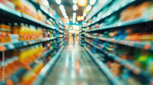 Blurred Supermarket Aisle with Colorful Shelves in Mall for Background