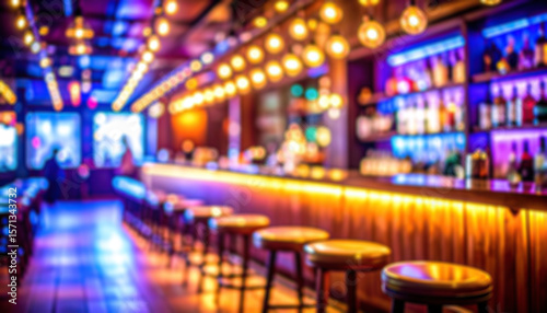 Blurred Vibrant blurred bar interior with bright lighting and seating area.