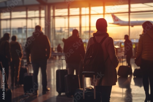 Boarding Ambiance on Airport Scene: Against the Sunset Backdrop, Passengers Assemble in Front of Departure Gate, Eagerly Awaiting the Call for Boarding.