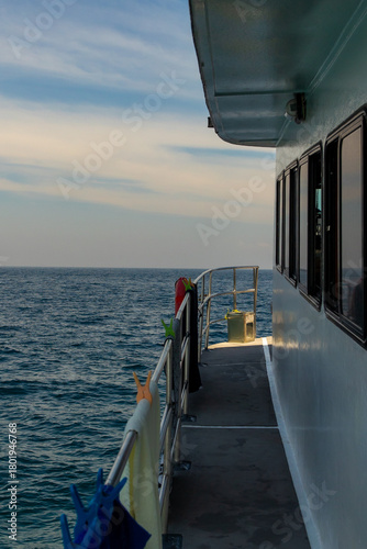 Boat deck above the sea in Thailand, calm ocean horizon and peaceful travel mood