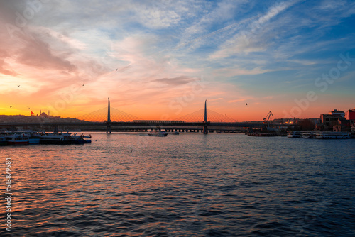 Boats in sea and scenic sunset in Istanbul
